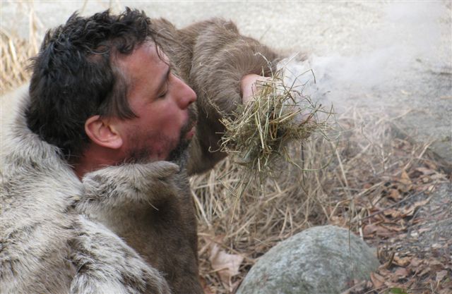 Rudi Walter beim steinzeitlichen Feuermachen. Foto: Sabine Rist, Tübingen